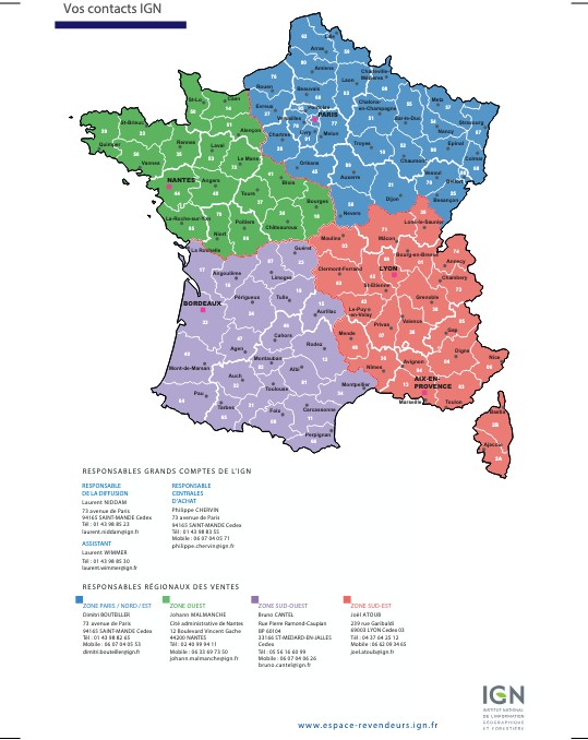 Vous souhaitez obtenir des informations sur l’IGN, devenir un revendeur de produits IGN… pour cela vous pouvez contacter soit un diffuseur des produits IGN soit prendre contact avec le commercial IGN de votre région.