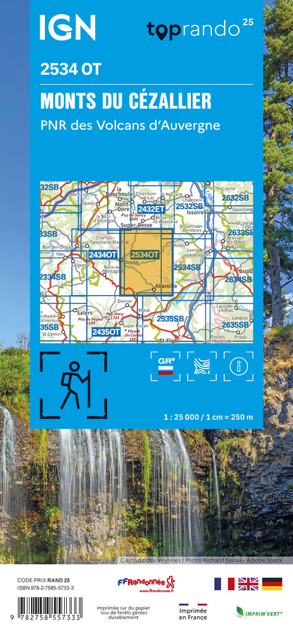 L'indispensable carte de randonnée IGN 2534OT. D'une très grande précision elle contient tous les détails existants sur le terrain : voies de communication jusqu'au moindre sentier, constructions jusqu'au hangar, bois, arbre isolé, rivière, source... Sans oublier la représentation du relief par des courbes de niveau. Les sentiers balisés et les informations touristiques sont également représentées.