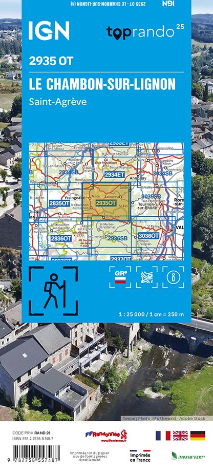 L'indispensable carte de randonnée IGN 2935OT. D'une très grande précision elle contient tous les détails existants sur le terrain : voies de communication jusqu'au moindre sentier, constructions jusqu'au hangar, bois, arbre isolé, rivière, source... Sans oublier la représentation du relief par des courbes de niveau. Les sentiers balisés et les informations touristiques sont également représentées.