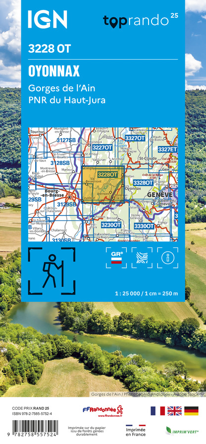 L'indispensable carte de randonnée IGN 3228OT. D'une très grande précision elle contient tous les détails existants sur le terrain : voies de communication jusqu'au moindre sentier, constructions jusqu'au hangar, bois, arbre isolé, rivière, source... Sans oublier la représentation du relief par des courbes de niveau. Les sentiers balisés et les informations touristiques sont également représentées.