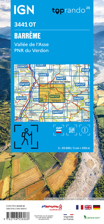 L'indispensable carte de randonnée IGN 3441OT. D'une très grande précision elle contient tous les détails existants sur le terrain : voies de communication jusqu'au moindre sentier, constructions jusqu'au hangar, bois, arbre isolé, rivière, source... Sans oublier la représentation du relief par des courbes de niveau. Les sentiers balisés et les informations touristiques sont également représentées.